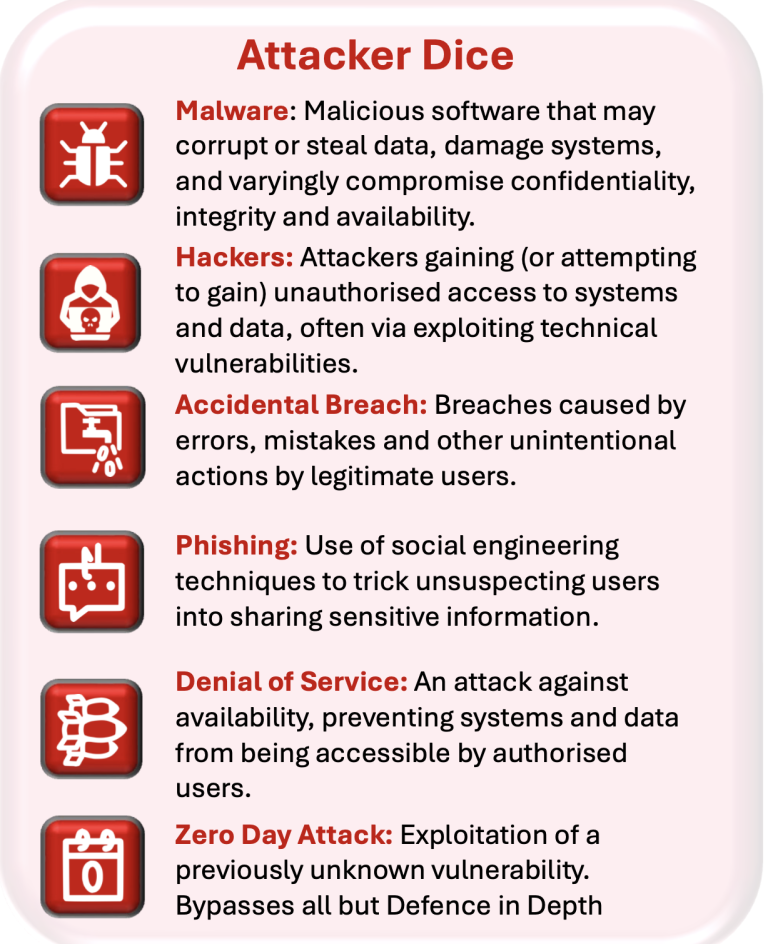 - a full range of other attacks (Malware, Hackers, Phishing, Accidental Breach, and DoS)