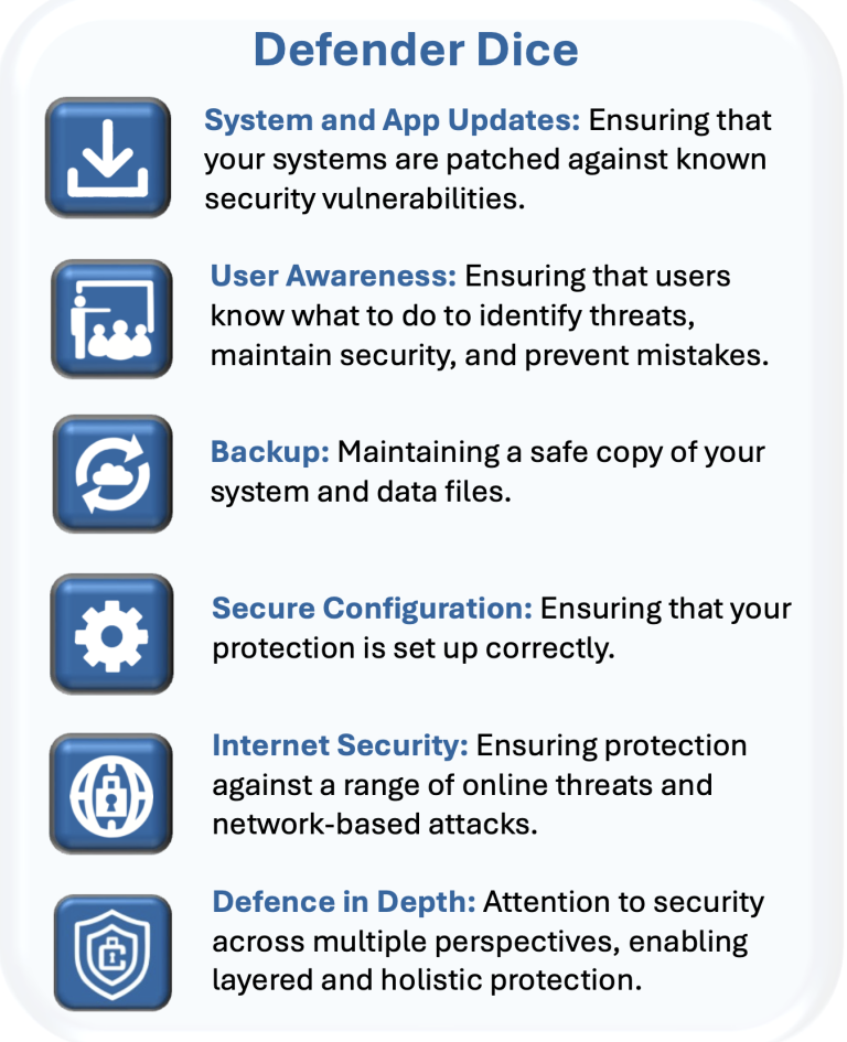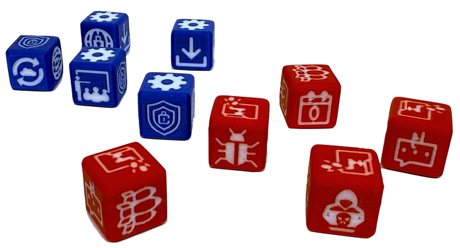 To win a round players need to throw more defence dice than the corresponding attack (or vice versa) – e.g. if 2 Malware dice are thrown then defenders need 3+ of other relevant dice to defend (e.g. 3 Backup, 3 Configuration or 3 Internet Security).